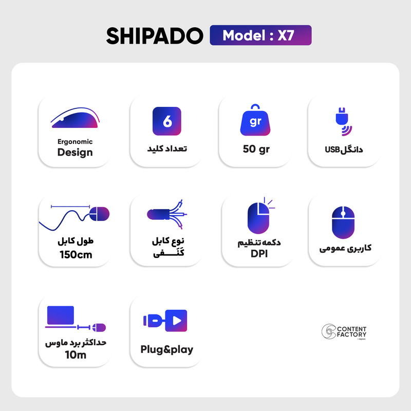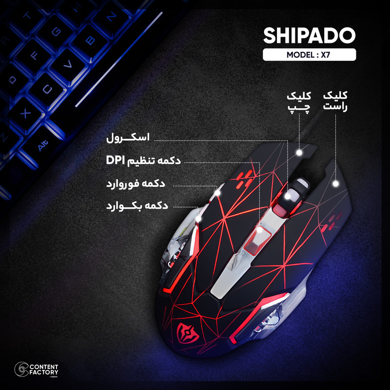 ماوس مولتی مدیا گیمینگ مدل X7 بسیار خوش دست و راحت در استفاده بوده و دارای سیم کنفی است که به هیچ وجه قطع نمیشود. کفی موس از جنس استیل بوده و بهراحتی روی پد موس میلغزد که برای گیمرها بسیار کاربردی است. با هر حرکت موس رنگ نور ال ای دی عوض میشود و اسکرول بزرگ و بسیار راحت است. این محصول با ظاهری بسیار زیبا و ارگونومیک با دست طراحی شده است تا در مدت زمان استفاده طولانی کمترین خستگی را برای دستان شما داشته باشد. این ماوس برای گیمرها (علاقه مندان به بازی های ویدئویی)، کاربران نرم افزار های طراحی (Photoshop و Corel Draw و ...) و کاربرانی که از نرم افزار های مهندسی (Auto Cad و 3D Max و ...) بسیار مناسب است. گفتنی است X7 دارای حسگر اپتیکال و 6 کلید است. ماوس دارای LED چند رنگ با نور بسیار عالی است که بصورت اتوماتیک تغییر رنگ میدهد. همچنین سری USB خاص و مقاومی دارد. ماوس از وزن بسیار مناسب برخوردار بوده و زیر ماوس بصورت فلزی طراحی شده است.ماوس گیمینگ X7 مناسب طراحان و بازی کنهای حرفهای کامپیوتر است تا در طولانی مدت استفاده از ماوس برایشان خسته کننده نباشد. طراحی ارگونومیک و جنس بدنه ضد تعرق لذت استفاده از آن را دوچندان میکند.