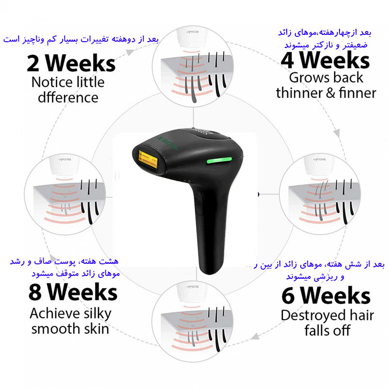 لیزر رفع موهای زائد ایکسول مدلS-5500 نسبت به مدلهای قدیمی تر دارای 25درصد سرعت بالاتر و در نتیجه صرفه جویی بیشتر در وقت و زمان انجام لیزر است. این دستگاه به عنوان لیزر بدن و صورت جهت استفاده خانگی و هم آرایشگاهی سالنی میباشد.این دستگاه می تواند برای انواع پوست و مو با رنگ های مختلف مورد استفاده قرار بگیرد. این دستگاه قابل استفاده برای موهای زائد بدن و صورت مخصوصا بالا و پشت لب میباشد. بایستی بدانید که هیچ یک از روش های رفع مو، دائمی و مادام العمر نیستند اما اثر لیزر نسبت به سایر روش های موجود ماندگاری بیشتری دارد. در ابتدا استفاده از لیزر تنها توسط دستگاه های موجود در کلینیک ها انجام می شد اما اخیرا انواع مدلهای لیزر خانگی به بازار آمده است .یکی از این دستگاهها، دستگاه لیزر خانگی ایکسول است.استفاده از دستگاه لیزر خانگی ایکسول نیاز به هیچ گونه علم و تخصصی ندارد. با تنظیم این دستگاه بر اساس رنگ پوست میتوان بهترین نتیجه را حاصل کرد. در ضمن شما می توانید با تنظیم 5 سطح مختلف انرژی، بسته به درجه حساسیت پوستهای مختلف دستگاه را برای تاثیر گذاری بیشتر به صورت دستی تنظیم نمایید. دستگاه لیزر خانگی ایکسول برای انواع پوست مناسب میباشد. یکی ازنکات مثبت این دستگاه تعداد شات بالای این دستگاه است که نسبت به سایر لیزرهای موجود بسیار زیاد است. مزیت دیگر این دستگاه این است که نسبت به دستگهای قدیمی نیاز به تعویض سری برای نواحی مختلف بدن ندارد و با تنظیم دستگاه به راحتی هر نقطه از بدن را به راحتی لیزر نمایید. در ضمن این دستگاه از نوع بدون درد میباشد. ممنوعیت استفاده برای زنان باردار و کودکان ممنوعیت استفاده برای پوست های که دارای بیماری های پوستی هستند پوست های دارای حساسیت و آلرژی باید با تایید متخصص پوست استفاده شود. قبل از استفاده حتما بروشور همراه محصول را مطالعه نمایید. کاربرد دیگر این مدل دستگاه لیزر ایکسول این است که میتوان در جهت کم کردن چین و چروک و جوانسازی پوست نیز استفاده نمود. این دستگاه بوسیله آداپتور به برق شهری متصل میشود.