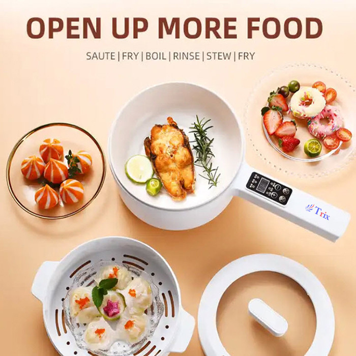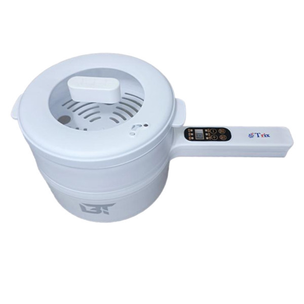 تابه و پخت و پز چند منظوره برقی از برند Trix دارای طراحی منحصر به فرد دو طبقه و دارای صفحه دیجیتال روی دسته آن میباشد. بسیار سبک و قابل حمل با توانایی انتقال سریع گرما، نه تنها برای پختن سوپ، فرنی، بلکه برای تهیه غذاهای سرخ شدنی و بخارپز را دارا می باشد. بسیار پرکاربرد مناسب منزل و مسافرت و هتلها و خوابگاههای دانشجویی و غیره میباشد علاوه بر این، روی درب، یک سوراخ دریچه ای نیز وجود دارد که به گردش بهتر بخار در دمای بالا کمک می کند و ایمنی در حین استفاده را تضمین می کند. از طرف دیگر رابط اتصال برق تعبیه شده روی دسته نیز ضد آب است و می توانید به راحتی محصول را راحت تر تمیز کنید. این محصول از انتهای دسته توسط کابل به برق شهری متصل میشود